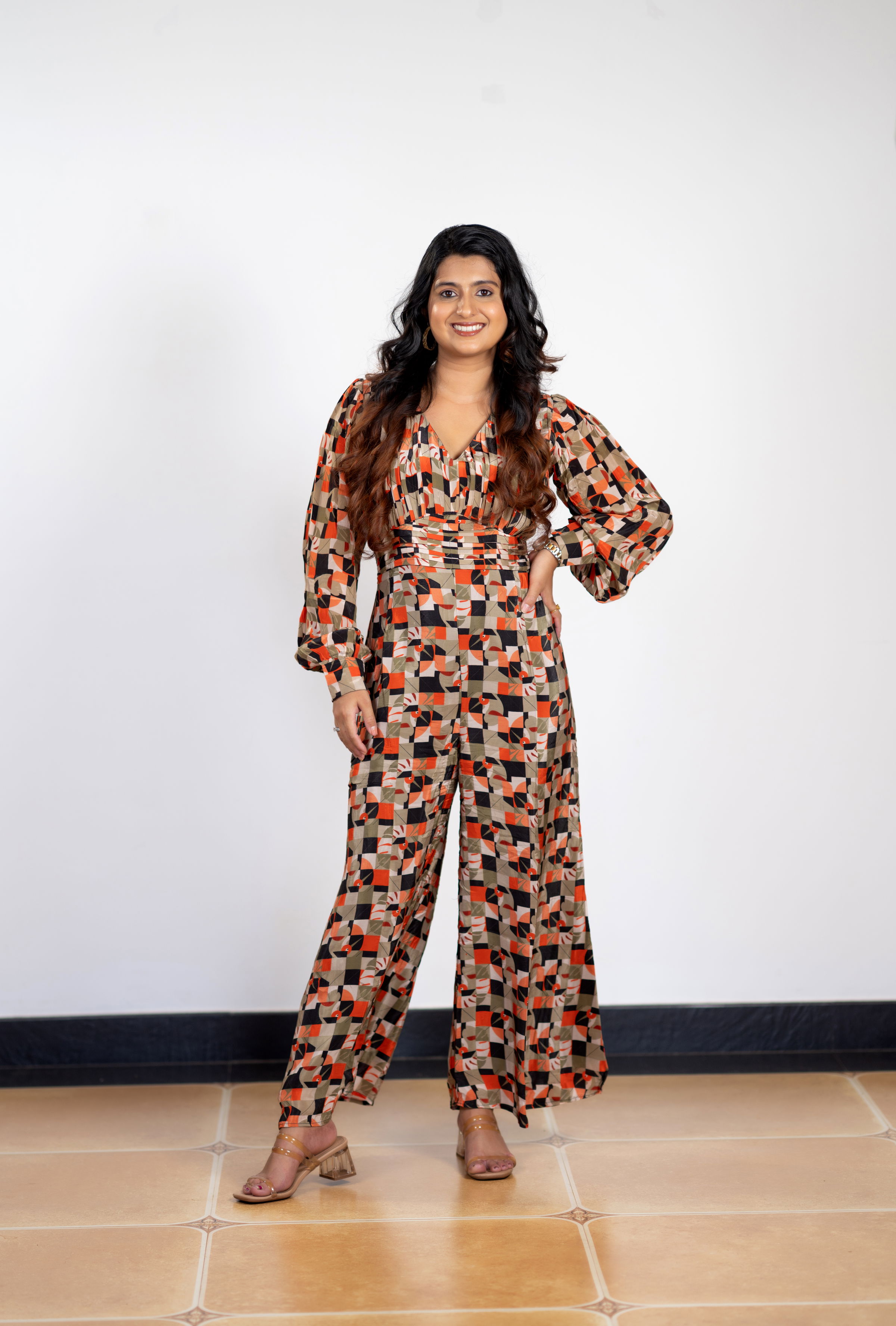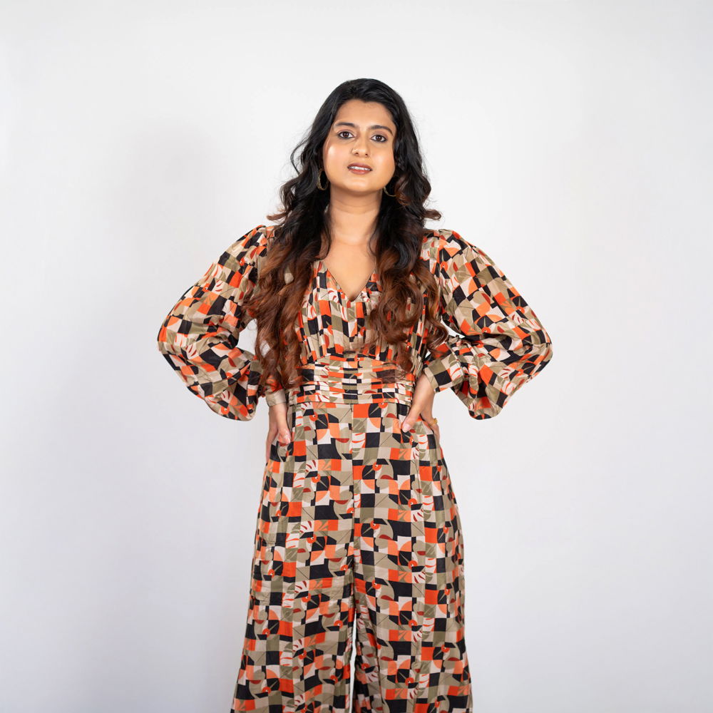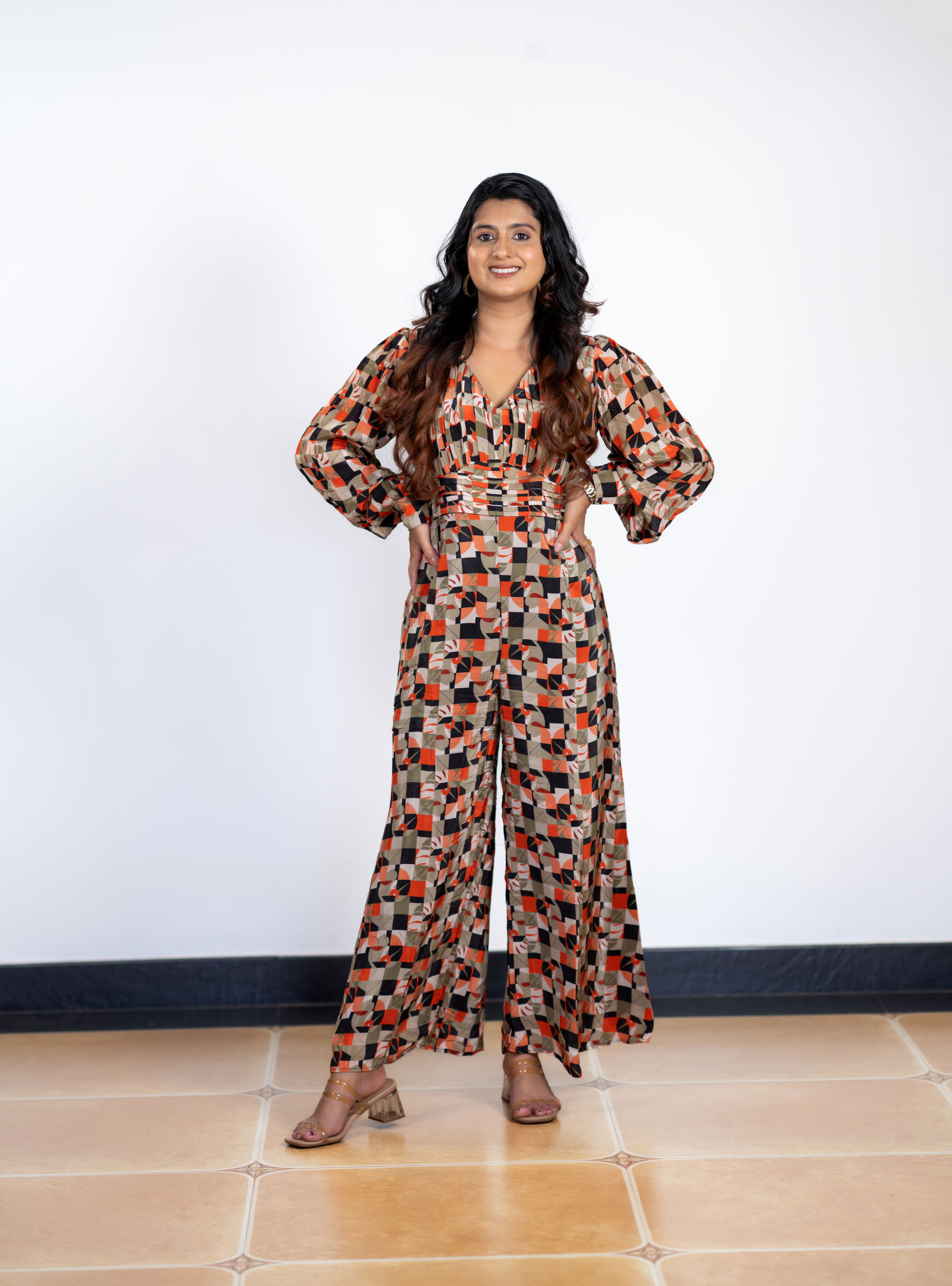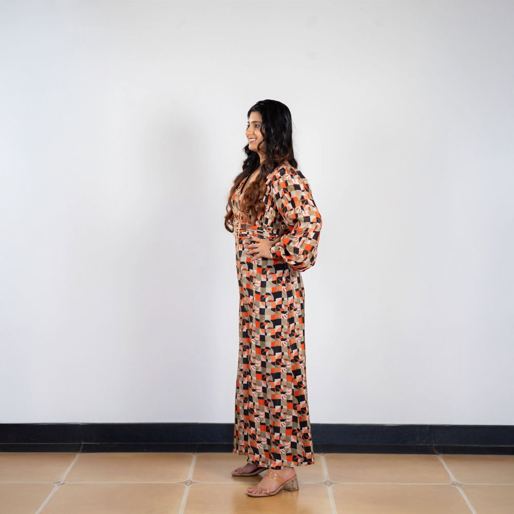 Be the first to review “Geometric-Shaped Natural Crepe Jumpsuit with Full-Length Balloon Sleeves”