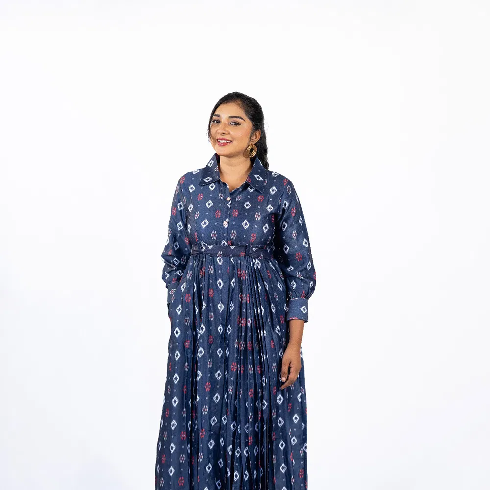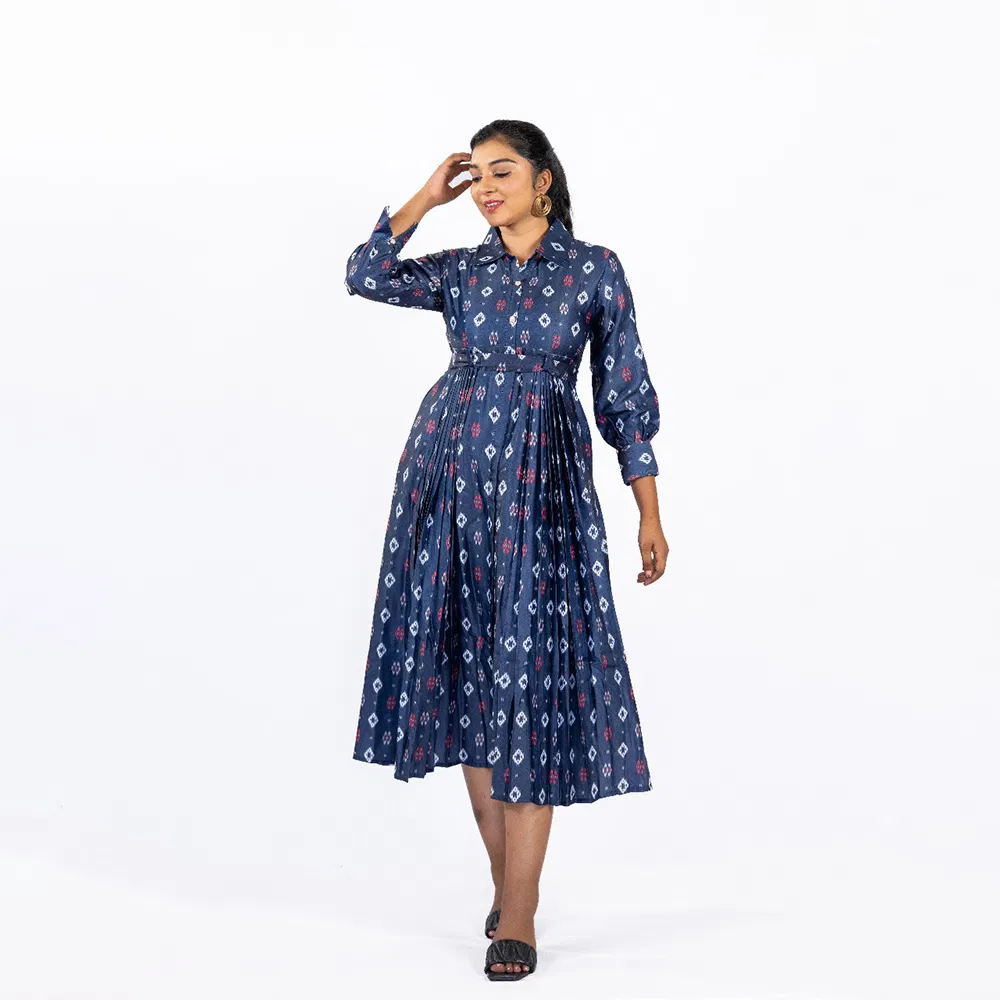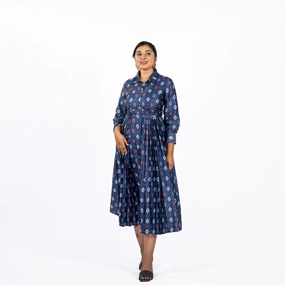 Ink Blue Linen Formal Dress with Neat Pleats and Belt to Go Along