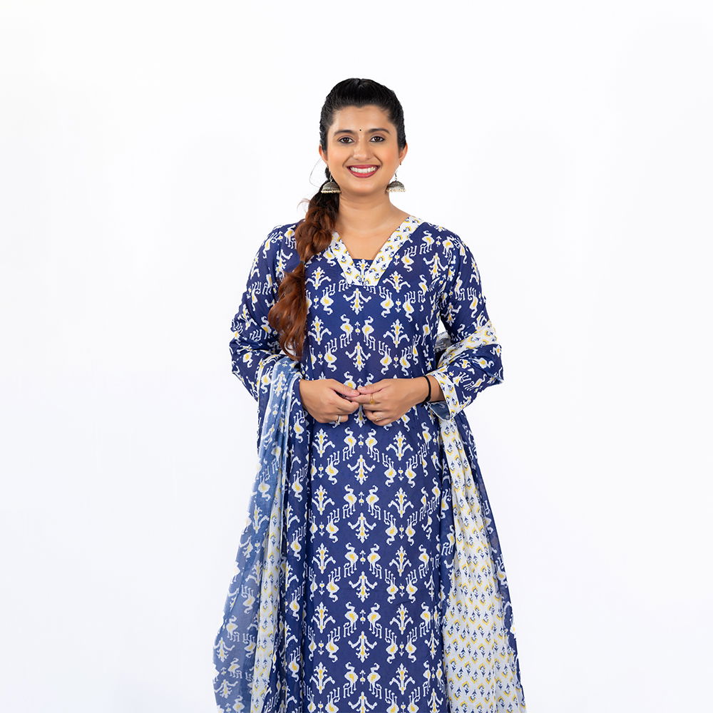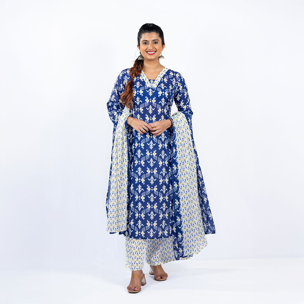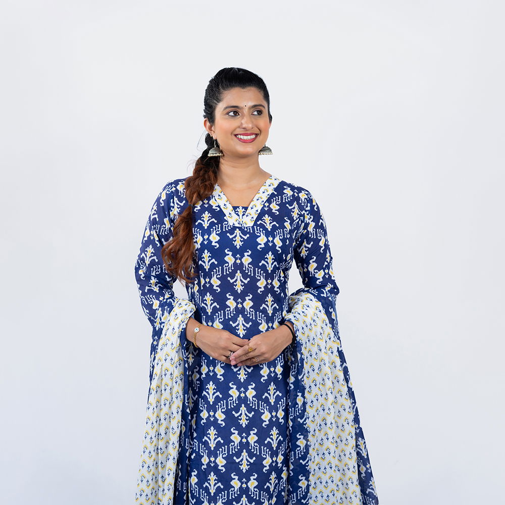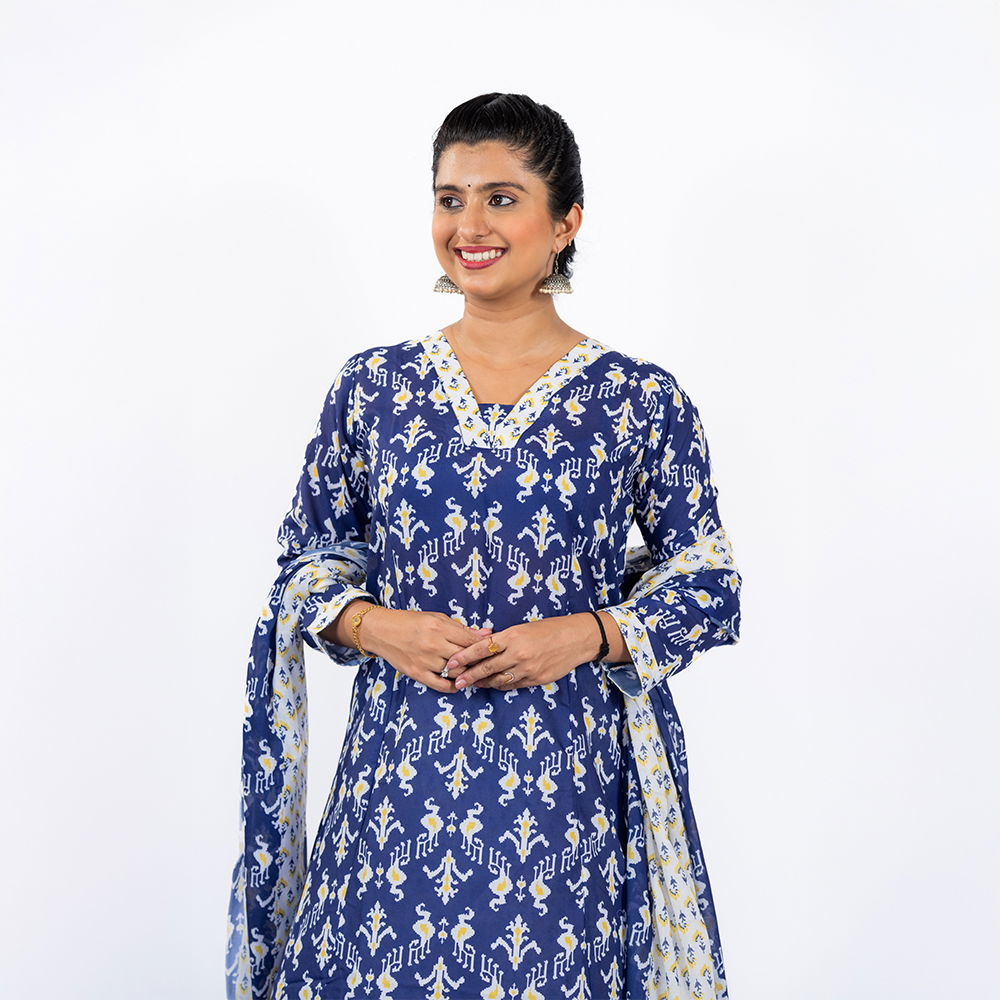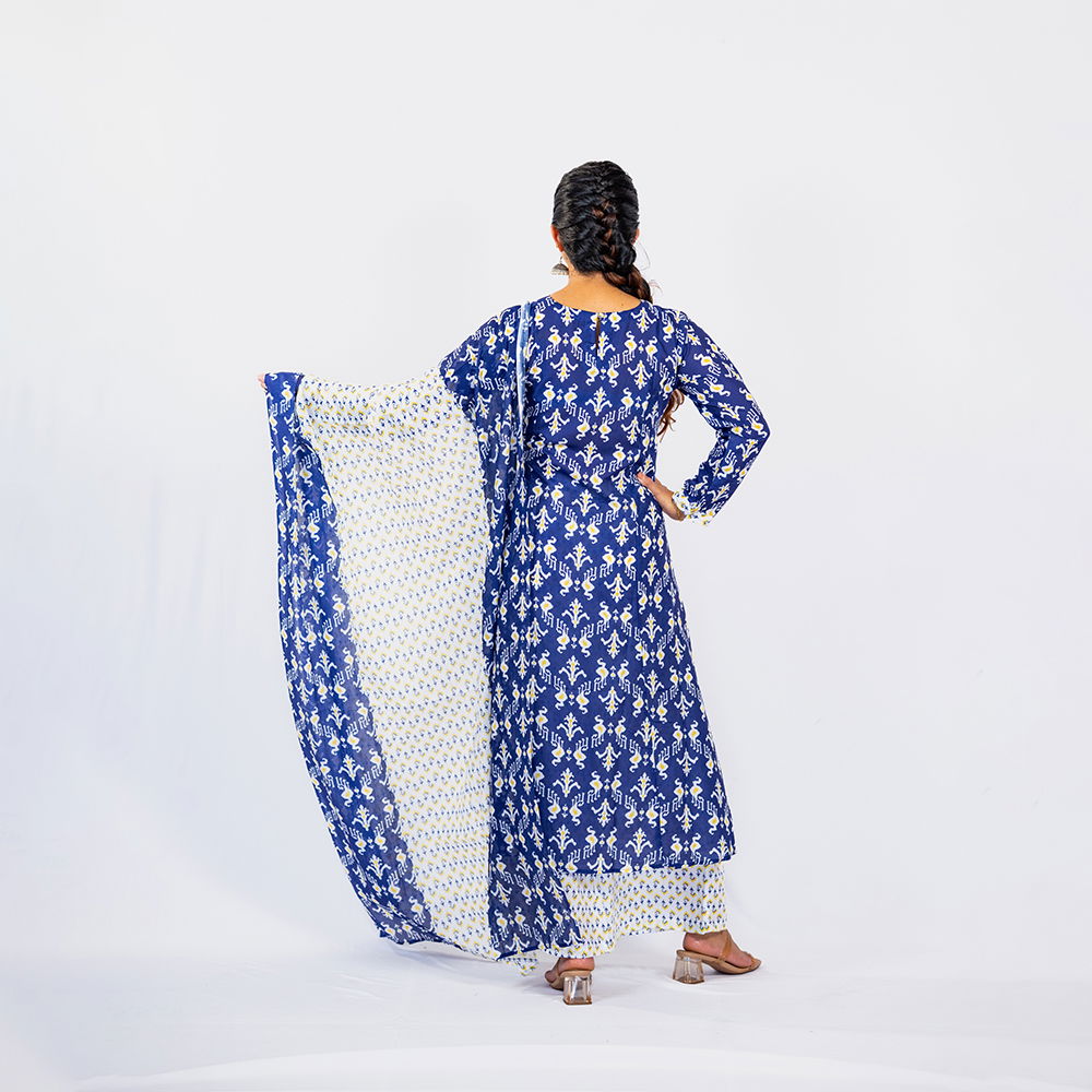 Be the first to review “Navy Blue with White and Yellow Pattern Palazzo and Dupatta in Pure Cotton”