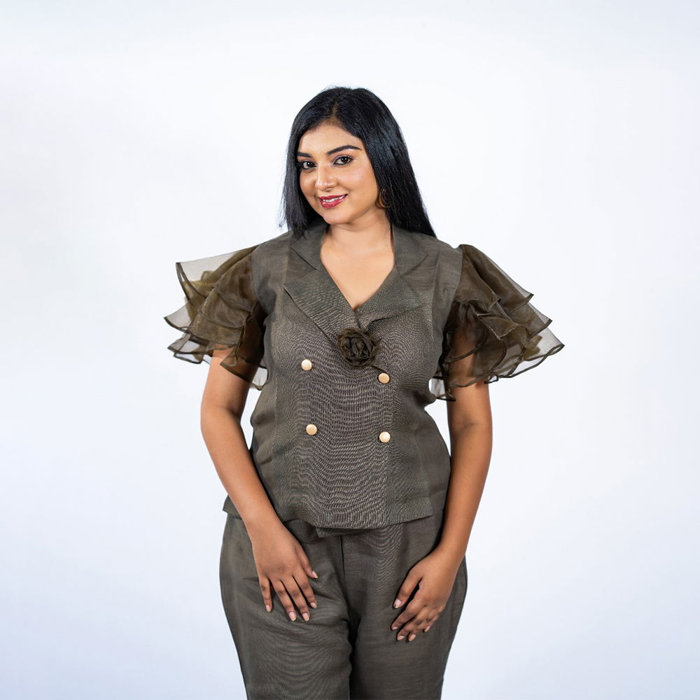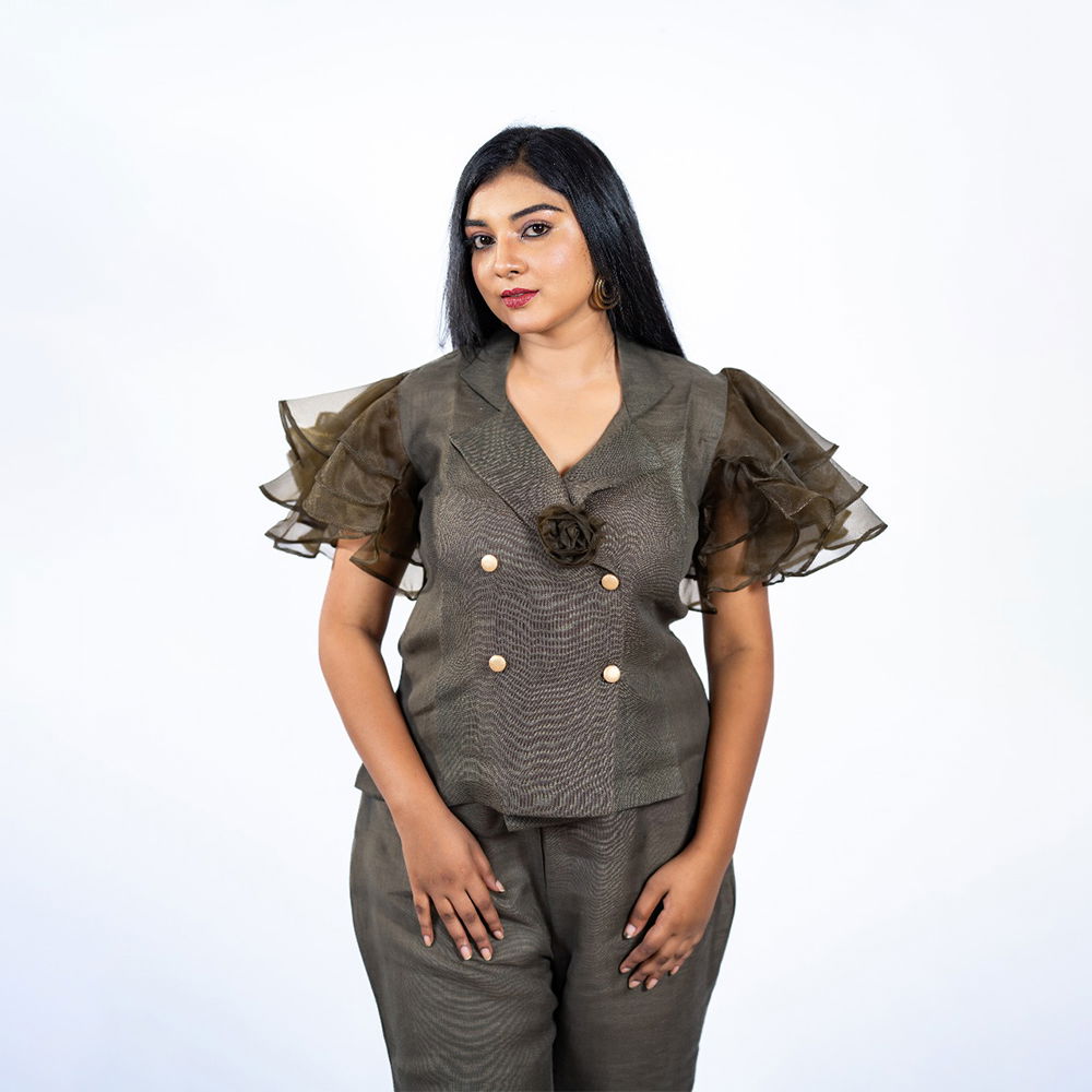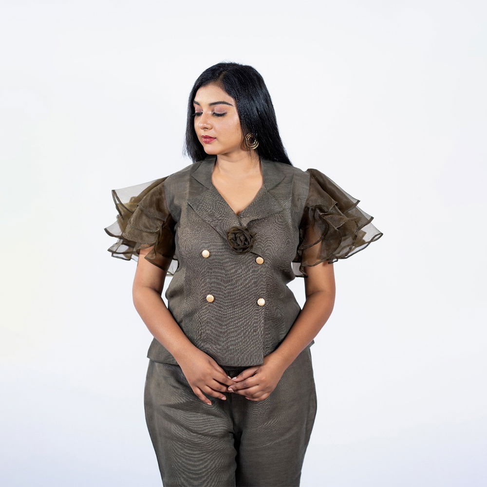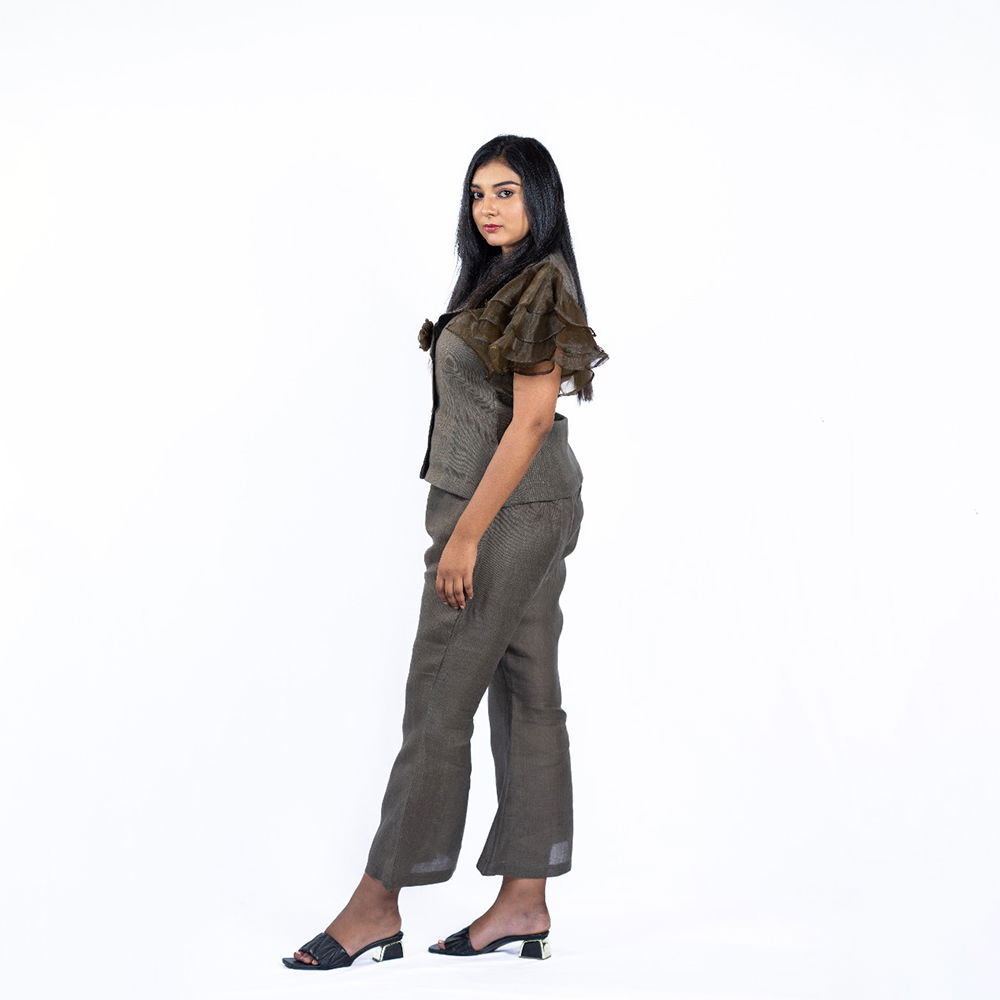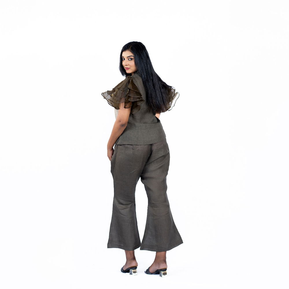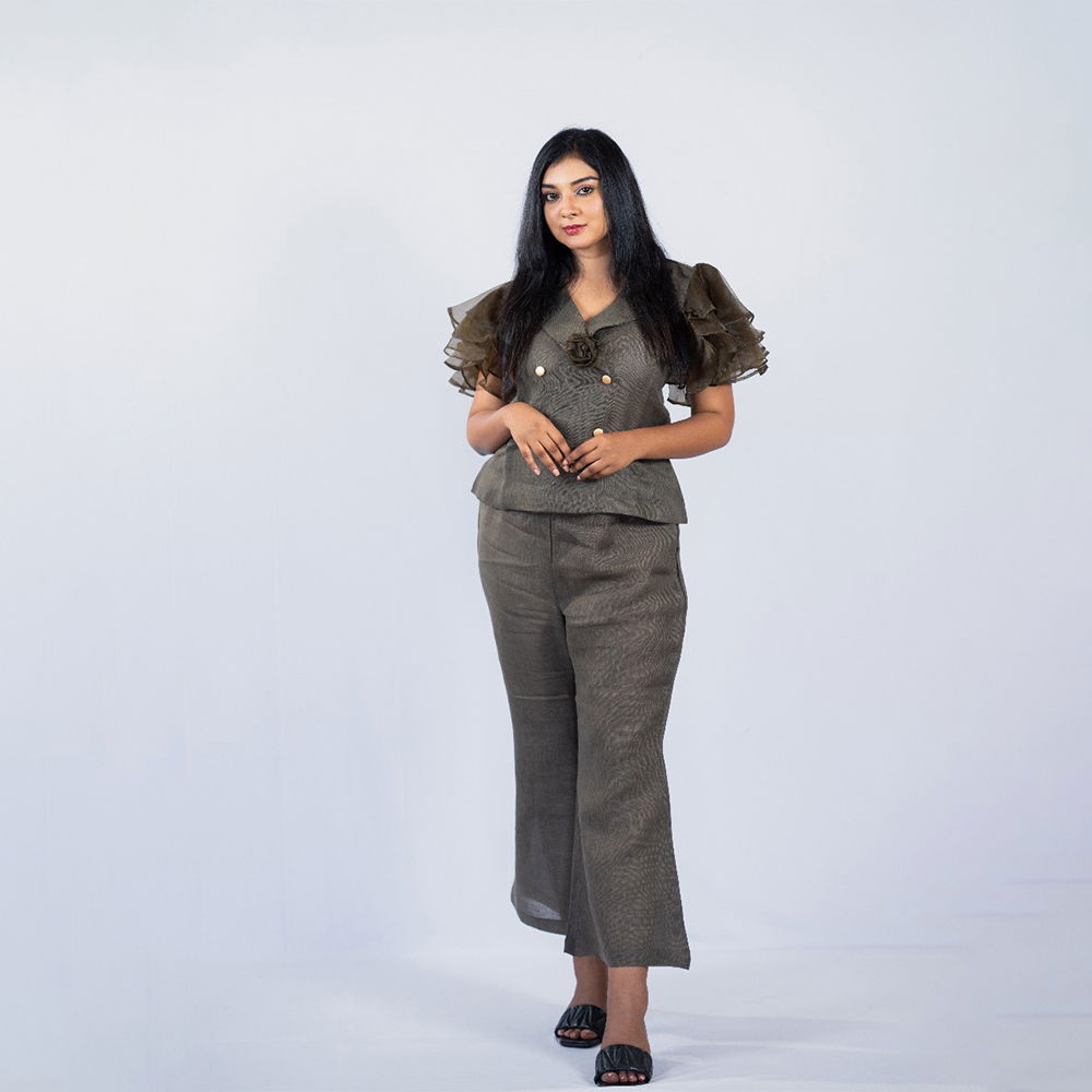 Turbo Ash Linen Cord Set with Organza Frill Sleeves